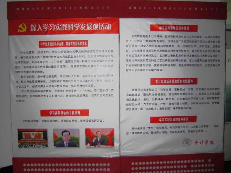 认真挖掘、总结学习实践活动中的亮点、特色及重点理论,成人网 以宣传展板为媒介,向全体师生宣传学习实践科学发展观的内容与精神。设在逸夫楼3楼大厅及4号教学楼前的展板吸引了不少师生的驻足,成为校园里师生学习科学发展观的一道风景。