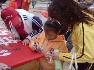 4月11日,距离第十一届全运会还有183天,上午9时会计0705的同学统一着装,早早的抵达章丘市百脉泉广场,阴沉的天气并未影响同学们的热情。记者观察发现,活动所需的音响、展板、桌子以及横幅都已提前运抵,可以看出主办方策划之周密,准备之精心。在同学们紧张而有序的准备工作之后,活动在男女主持人高亢激昂的声音中开始了。首先,会计0705全体同学宣誓,“点燃激情,放飞梦想”,“信念,让我们凝聚在一起;勇气,让我们一路拼搏”,“用汗水谱写2009,用辉煌照亮神州大地”……充满激情的宣誓声回响在偌大的广场中,铿锵有力的语句充分展现了当代大学生的精神风采,也吸引了晨练的市民和来往的行人。紧接着进行的是家乡风采的展示,来自各地的同学以展板为基点,为前来参观的老人,小孩,学生等耐心详细地介绍山东省17个市的风土民情。细致的讲解让并不专业的同学们俨然一个个经验丰富的导游,从名称由来到历史概况,从方言风俗到美食旅游,当然还有必不可少的部分——该市与此次全运会的联系。一位老人听了讲解很是高兴,不禁也发表起自己的看法,跟同学们聊得火热。在交流中,市民们更加了解山东,了解全运,同学们也学到了知识,提高了自己的沟通能力。最后进行的是签名仪式,主办方展开了名为“舞动城市魅力, 挥洒全运风采”的横幅,号召在场所有人在横幅上签字以表示自己对全运会的支持。军人、学生、公司职员、写字时手略有些发抖的老人,就连刚学会写名字的孩子也参与到其中,广场上热闹非凡。