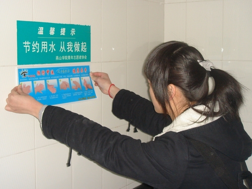日前,成人网 基本功部成员到章丘疾控中心学习了相关预防甲型H1N1流感及“六步洗手法”的知识。15日晚上7点,基本功部成员在校园各个净手处(洗手间、食堂、宿舍的公共洗漱间)张贴印有“六步洗手法”图样的宣传画报,指导大家用科学的方法净手。同学们看到宣传画后,纷纷表示“六步洗手法”及时又实用,对大家预防甲型H1N1流感很有帮助。