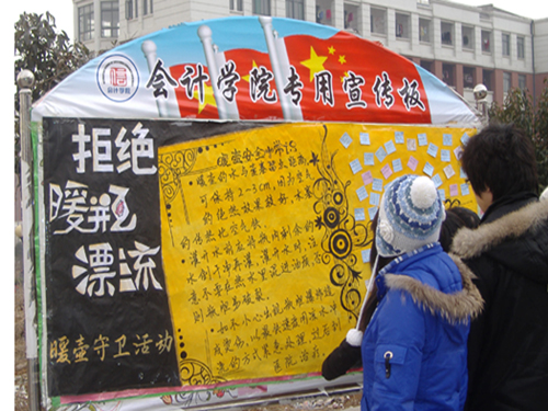 此次活动分为标语征集和签字仪式两部分。由于正值中午,打水的同学络绎不绝,大家纷纷在宣传栏前驻足观看。“暖壶安全小常识”温馨提示着如何正确使用暖壶、如何防止暖壶爆炸一句爆炸后如何处理等等,给予了同学们很大帮助。“寒风萧瑟瑟,暖暖在人心”,许多同学在“注意用壶安全,拒绝暖壶漂流”的横幅上签名,并将自己的心愿写在了小贴士上,以此希望杜绝偷壶现象的发生。