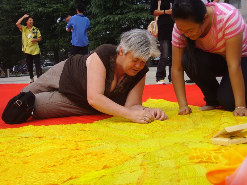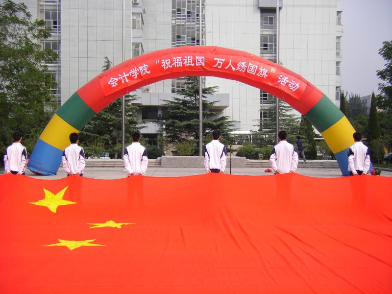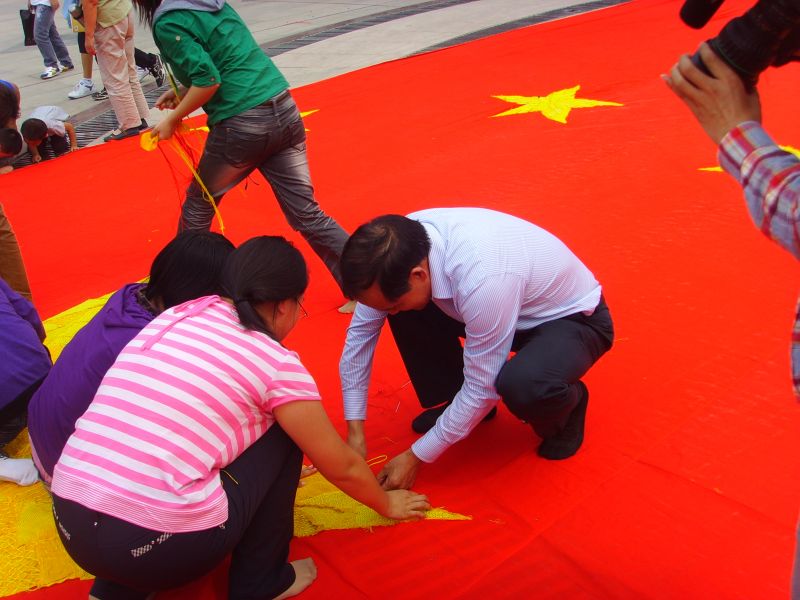 校领导和学生代表在现场一起动手参与,缝绣国旗。据了解,国旗长20.09米,代表今年2009年;国旗上的大星共缝6000针,代表祖国60华诞;小星共缝1949针,代表祖国1949年诞生;大星共由56块小区域组成,代表祖国56个民族团结大家庭;小星共由60块小区域组成,代表祖国60岁华诞。五颗星绣制难度大,耗时长,为了表达莘莘学子的爱国热情,这艰巨的工程9月初入学时同学们就从一针一线开始,终于在国庆前赶制出来。