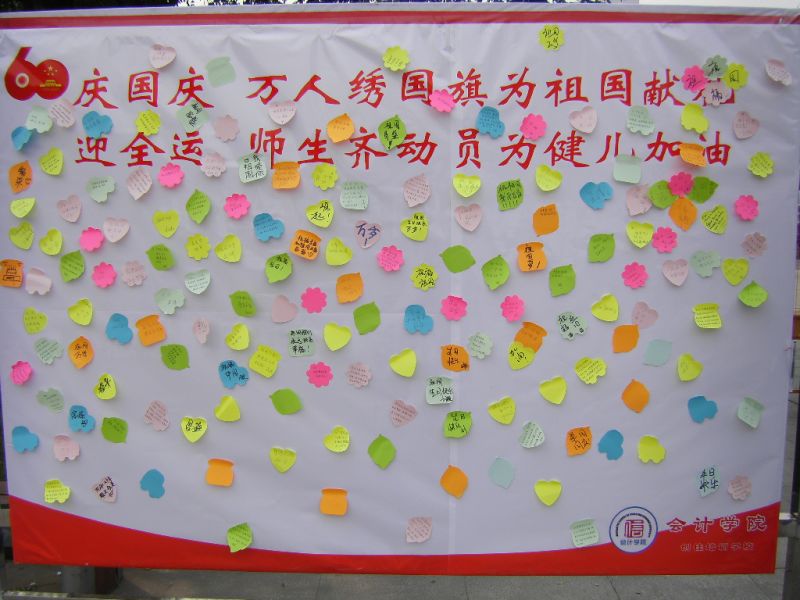 此外,成人网 在现场设立心愿便利贴,大家在心形、星形的便利贴上纷纷留言,写下对祖国祝福的话语。写有“庆国庆,万人绣国旗为祖国献礼,迎全运,师生齐动员为健儿加油”的条幅上贴满了现场采集的笑脸,写满了来自全校师生的祝福。最后,全体同学与国旗合影。