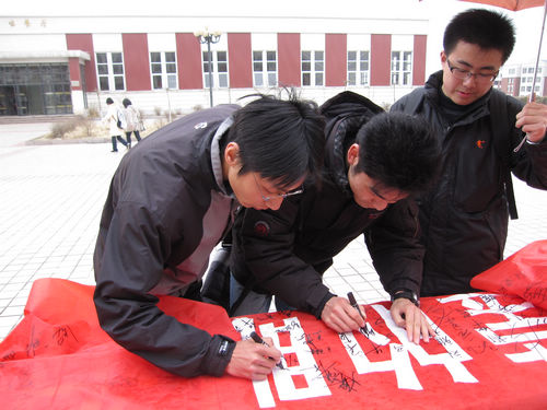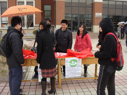 承然环保协会“世界水日:我们在行动”签名活动于明水校区两餐厅之间启动,号召大家保护环境,保护水源。虽然细雨蒙蒙,但广大师生仍热情高涨,积极地参与并在印有“世界水日:珍爱母亲晶莹的眼泪”的条幅上郑重的签下自己的名字,希望通过这一活动表达自己对水资源珍爱之情。同时,承然环保协会的理事也在向同学们讲述有关水资源的环保知识。