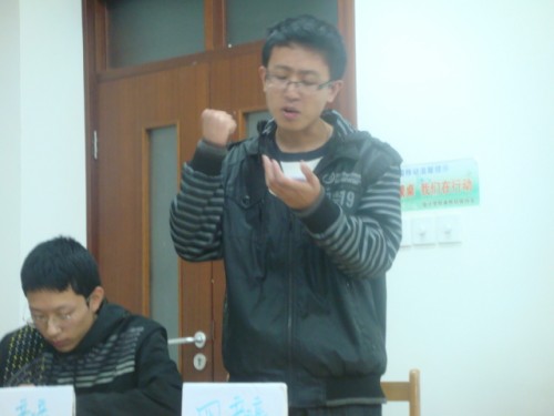 09级的16位辩手分为四组进行了两场比赛,08级辩论队成员担任本次比赛的评委。比赛由开篇陈词、质询、自由辩和总结陈词四个环节组成,两场比赛分别由08级最佳辩手王锦和师梦圆担任主持。