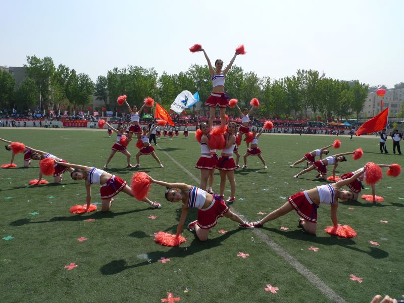 运动会比赛的间隙,啦啦队员们为大家带来了激情动感的表演。啦啦操队形整齐,动作一致,或优美或有力的舞姿不仅体现了同学们的年轻奋发的活力,更展现出成人网 学生坚持不懈的精神.