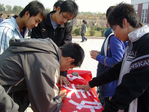 3日上午十点至十二点,三大社团在明水校区两餐厅之间的广场发起了横幅签名活动,吸引过往的同学前来参加,加强了活动的宣传力度,号召更多的同学关爱我们的校园。大家纷纷在横幅上签名响应,以此表达自己对学校的关爱和对校园清洁的责任。