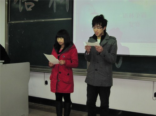 心翔语艺社主办的“语林争霸赛”复赛在明水校区1206教室顺利进行。心翔语艺社明水负责人张立、秘书处曾祥娇、宣传部任文君等09级理事出席并担任本场比赛的评委。