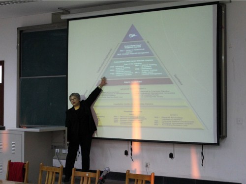 讲座正式开始前,孙文刚副院长首先结合实际分析了未来发展将要面对的形势,并深述了会计与经济发展的必然联系,阐明了“会计”在当今世界的重要地位。随后讲座正式开始,加拿大注册会计师协会中国区执行理事高凤敏女士作为代表进行了演讲,从各个方面为大家分析了会计这个职业,对“会计”这一名词做出了新的诠释。其后,高女士为大家展示了“职业会计师的技能框架”并介绍了加拿大注册会计师专业培训的课程设置,这套学习系统完全不同于大家平时所接触了教学模式,这种培养方式目的就是将人才国际化,世界化,真正的适应世界的发展。其间高凤敏女士穿插了学历与专业资格的比较、专业会计师与传统会计师的比较等内容,并分析了“行业”、“专业”、“职业”与“执业”的深层含义,告诫大家在学习知识的同时也要注重培养职业道德与实践能力,应该有意识的培养自身的专业判断力,现场同学细心记录,受益匪浅。演讲最后,高女士以历届毕业生为例向观众展现了就业前景,并用“人生的平衡”作为结束语,回味无穷。之后,同学们众针对这种培养方式提出了疑问,而CGA中国区相关负责人也一一做出解答。