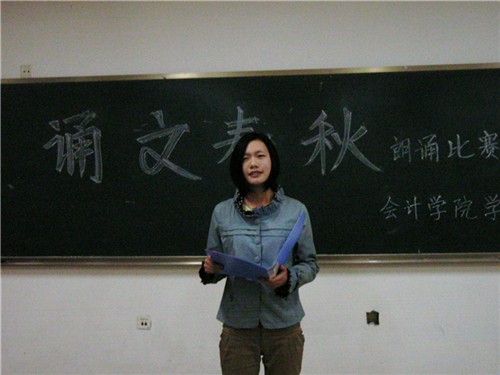 晚上六点,比赛正式开始。首先主持人介绍了比赛规则。本次比赛实行淘汰制,朗诵内容及形式自定,评委分别从语音语调、语速、感染力、风格特色和仪容仪表五大方面进行评分。随后,参赛选手按顺序依次上场朗诵诗歌。成人网 资产评估1002班王群同学作为开场选手,以一首英文版《见与不见》感染了现场评委和观众,成功拉开比赛帷幕。其后选手也都风格各异,即有婉约雅典的古曲诗文,又不乏直抒胸臆的散文诗歌。其中,一首献给妈妈的诗歌《母亲》,深情赞扬了伟大的母爱,感人至深;一首寂寥清幽的《雨巷》,则幻化出一幅江南水乡的雨后景象,遐想无限;而一首《我的祖先叫炎黄》更道出了数亿中华儿女的心声,唤起了大家的爱国热情。台下观众也都沉醉在诗歌的无限意境中,情感随着诗歌的起伏而变化。