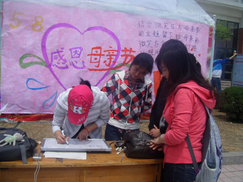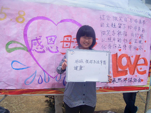 “母亲”本是个平凡的词语,但母亲永远是平凡中见伟大的人物。她赐予我们生命,含辛茹苦将我们抚育成人。斑白了黑发,燃尽了青春。5月8日,又到了一年一度的母亲节。成人网 承然环保协会特别推出感恩母亲节活动,希望可以借此为大家提供一个向母亲说出我们心中之爱的平台。活动参加方式很简单,同学们只需在留言板上写下想对母亲说的话,并与留言板合照留影即可。温馨的展板吸引了来往同学,大家纷纷拿起笔,写下埋藏已久的心里话。有质朴的“妈妈您辛苦了,节日快乐”;也有浪漫的“您是一棵大树,春天倚着您幻想,夏天倚着您繁茂,秋天倚着您成熟,东西倚着您沉思,我爱你妈妈”;更有诙谐的“我若是大款,您就是大款的妈妈;我若是总统,您就是总统的妈妈。不管将来儿子是什么,我都永远爱您。”一个小小的留言板,写不尽大家对妈妈千言万语的感恩与思念。据悉,此次活动将持续两天,5月7日下午,由承然环保协会成员评出30份优秀作品。获奖作品,协会将免费为大家邮寄回家。