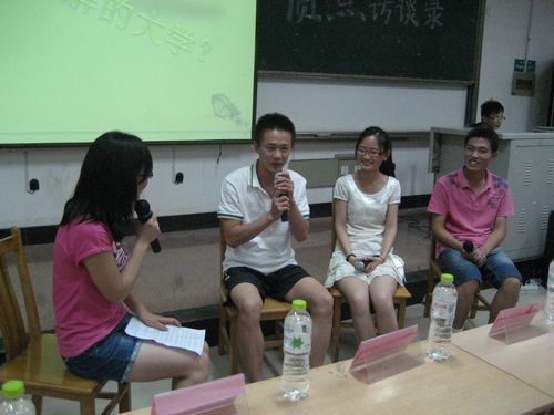 此次活动借助访谈的形式在四个环节中,让即将离开明水搬至本部的大二学子从学习生活、学生工作、质点通讯社工作、社团活动四个角度同大家分享了两年来的点滴经历和心灵感悟。首先,2010级学业上的佼佼者孙润楠、崔立泱、吕国成就大一学生所关注的专业学习、英语四六级考试、辅修二专业、自考各类证书等问题作出了简单介绍和经验的分享。“考证一方面给就业增添筹码,但如果忽视了本专业的学习则会得不偿失。”在问到当下大学生“考证热”现象时,孙润楠如是说。之后,成人网 学习部、宣传部、基本功部及生活部的负责人作为学生工作者的代表向现场观众介绍了自己的工作经验和心得体会。而后,身为主办方的质点通讯社,在第三环节中由记者团、网信部、编辑部负责人为观众简介了三个部门的工作内容,讲述了通讯社中“像一家人一样”工作和友情的双重收获。由通讯社成员们演绎原创社歌《心手相牵》则讲当晚访谈推向了高潮。在社团活动环节中,成人网 辩论队、承然环保协会、及星火志愿者协会的负责人则分别讲述了辩论队赛场下不为人知的辛苦和绽放大学之美的社团活动,真情展现了大学生活中平凡但又精彩的体验。最终,在财务管理1101班的大合唱——《明天会更好》的旋律中,访谈圆满结束。