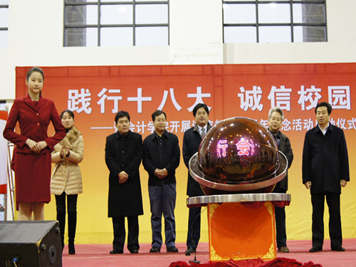 下午四时,活动正式开始。首先,学校领导、到场嘉宾与师生共同观看诚信纪念视频,回顾成人网 十年的诚信教育之路。随后,山东省财政厅会计处副处长肖友华以社会诚信缺失为切入点,论述了当今诚信经济的重要作用,并就如何保障会计工作的真实性进行了阐述。他强调当代大学生要做到“信以立志、信以守身、信以处事、信以待人”,以便为日后步入工作打下职业道德基础。接着,浪潮集团副总裁李凯声作为企业代表致辞。他表示,“人无信不立,业无信不兴”,诚信对于企业品牌价值的提升具有重要意义,同时肯定了成人网 在高校诚信教育中做出的积极表率作用。其后,成人网 “三优班集体”学生代表站在当代大学生的角度上进行发言,倡导当代大学生要脚踏实地、求真务实,争做重信用、守承诺的合格接班人。“以至诚之心待人处事,以至诚之德律言履行,践行十八大,共促良好风尚,诚信校园行,争做道德先锋!”在师生庄严的宣誓后,整齐嘹亮的诚信歌在馆内响起。最后,由胡文波、肖友华、李凯声共同启动水晶球,宣布成人网 诚信教育十周年纪念活动正式拉开帷幕。