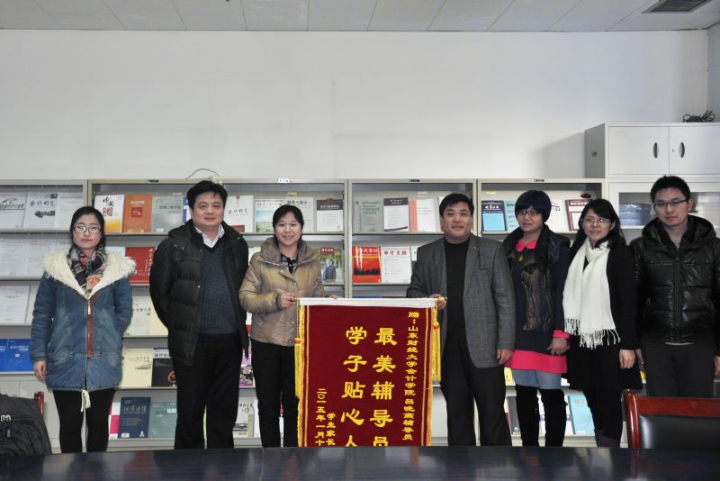 审计1101班学生李秀琳的父亲将一面写着“最美辅导员,学子贴心人”的锦旗送到了辅导员吕晓燕老师的手上。