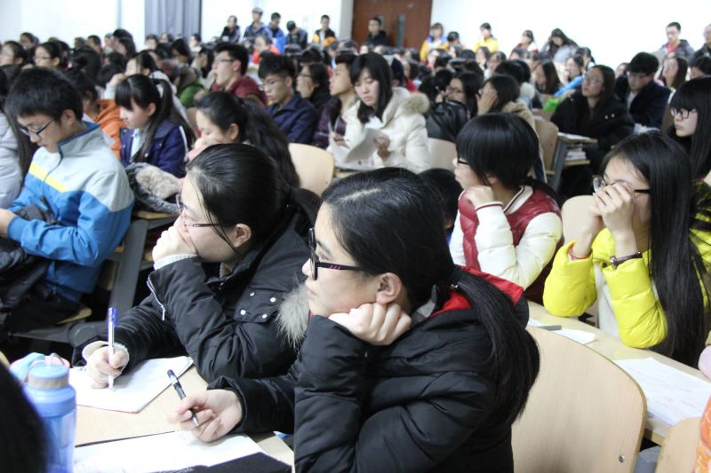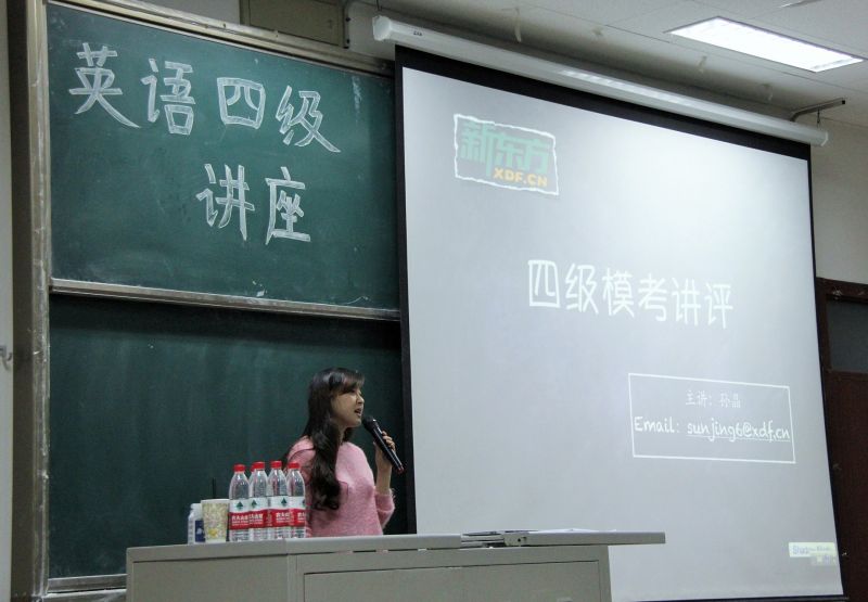 学习部与新东方联合举办的英语四六级指导讲座在明水1115教室顺利举行。来自济南新东方英语培训机构的王艺、孙晶两位老师应邀担任了本次讲座的主讲人。现场挤满了前来聆听四级考试技巧与经验的同学,气氛十分热烈。