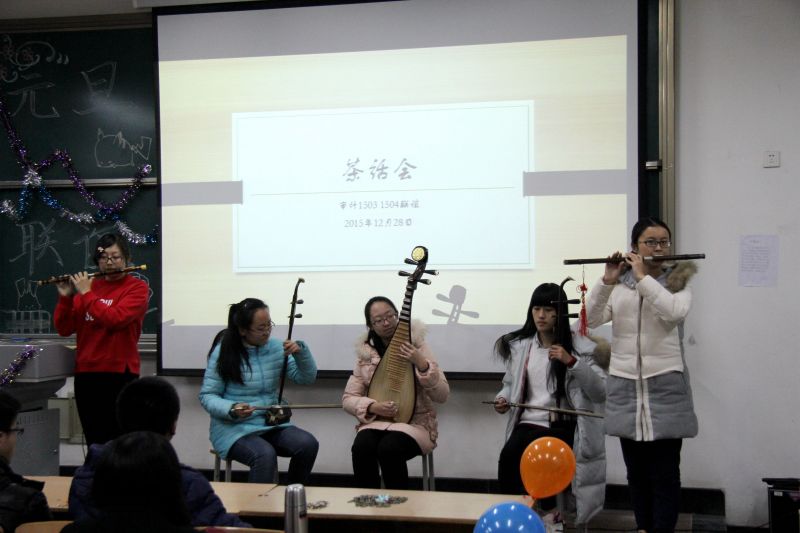 各教室茶话会座无虚席,场面温馨,节目各异,精彩纷呈。会计1402班邓雄文同学演唱的《偏偏喜欢你》在舒缓的旋律中诉说柔情,唱着生活里的悲喜哀愁。15级财管四个班的同学献上歌曲串烧,带大家重温经典,用音乐诠释着或温情或悲伤的故事,现场同学挥动荧光棒,沉醉其中。更有财管1503班同学带来小品表演《后宫》,故事别出心裁,语言诙谐幽默,夸张而生动的表演引得观众笑声不断。当镜头切换到另几个教室的茶话会,又是另一番精彩热闹的场景。审计1502班同学的双截棍表演威风堂堂,一招一式尽显武者风采,而由15级会计实验班带来的葫芦丝表演《卷珠帘》古风十足,余音绕梁,灵动之美使人留连其中。资评1501班的男生合唱《老男孩》和资评1502班的男生合唱《我的好兄弟》情意满满,用歌声传递深情、表达友谊。茶话会精彩节目之余,还有“抢凳子”“挤气球”等游戏环节,同学们都积极参与,欢笑掌声此起彼伏。同时,燕山校区12级、13级各班也带来精彩表演。
