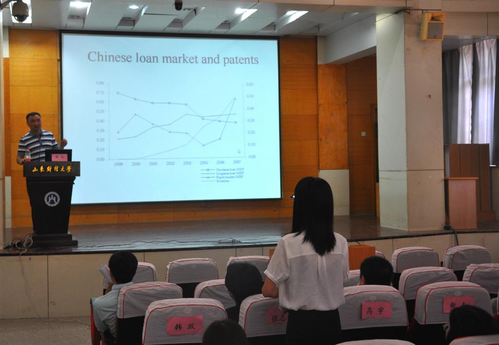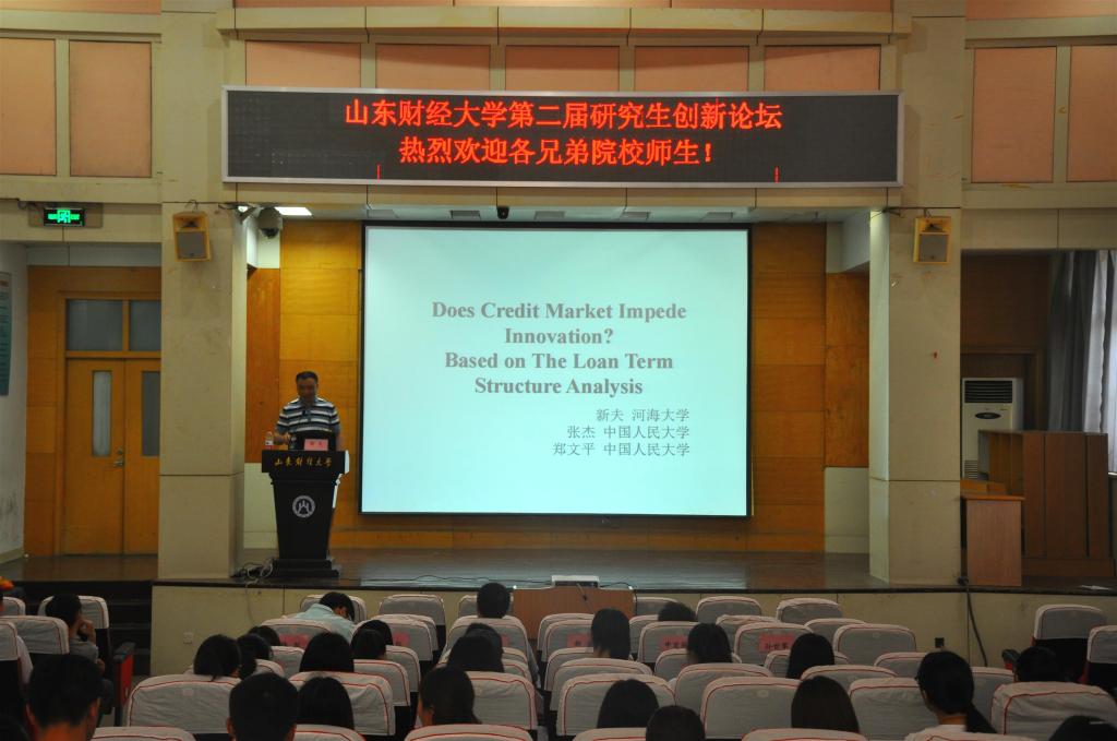 会计系新夫教授以”Dose credit market impede innovation?Based on The Loan Term Structure Analysis”为题进行了学术报告。新夫教授先就如何选择论文题目与同学们分享了一些自己的观点。他将论文选题角度分为红海和蓝海两个战略,让同学们认真思考是进入竞争激烈的红海还是选取较少有人涉足的蓝海,新夫教授同时也给出了自己在学术研究道路上选择论文题目的一些实践经验。随后新夫教授以中国专利大爆炸为背景向同学们介绍了创新领域的前沿热点问题以及一些有名的学术文章和知名学者,使得在座同学们受益匪浅。现场在座的研究生们就自己感兴趣的方面向新夫教授提出了问题,新夫教授也一一做出了认真详细的回答,并在最后鼓励同学们在自己感兴趣的学术领域深入挖掘下去,争取做出有创新意义的研究成果。