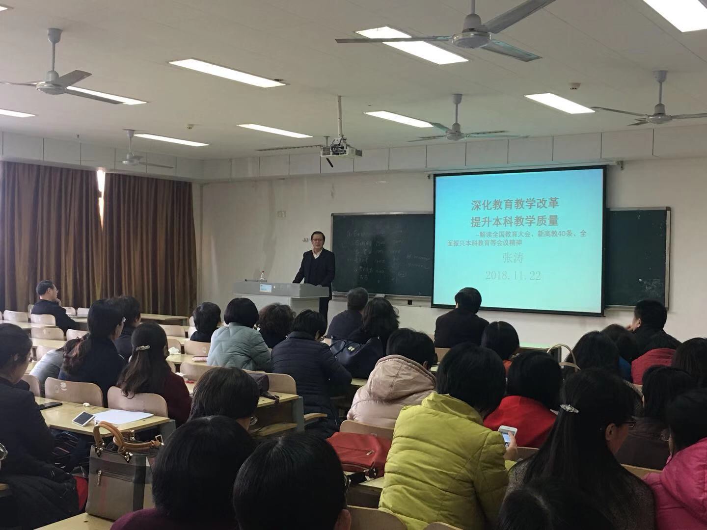 11月22日下午,成人网 召开全体教职工大会,成人网 党委书记张涛做了题为“深化教育教学改革、提升本科教学质量”的报告,解读全国教育大会精神、学习教育部全国高等学校本科教育工作会议以及新高教40条,分析当前本科教育形势、畅谈高等教育“创新”理念。