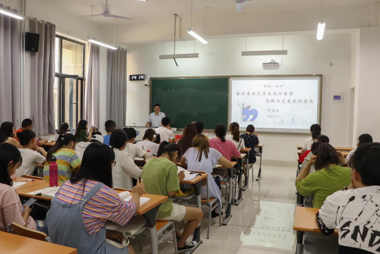 6月27日下午14:00,由成人网 合作发展处(成人网 工作办公室)主办,成人网 承办的中财财经讲座第四讲、中泰财经讲座第四期、成人网 讲堂第23期暨“领航•会计”资深成人网 经验分享会在圣井校区6-111教室举行。成人网 1990级会计本科成人网 郭法远做了题为《会计专业大学生成功要素与职业发展规划指南》的主题分享,成人网 党委副书记崔东峰,辅导员赵鸿雁、孙炯明参加活动。活动由崔东峰主持。