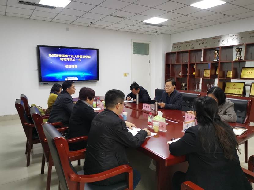 王爱国首先对远道而来的客人表示欢迎。他说:河南工业大学的前身是郑州粮食成人网 ,是共和国历史上著名的粮食行业“黄埔军校”。当前,粮食安全是维护国家安全的重要基石,党和国家对保障我国粮食安全提出了新的要求。在“粮食安全”上升为国家战略的政策背景下,河南工业大学管理成人网 基于粮食管理,围绕粮油电商、期货和物流管理,开展智能会计尤其智能会计核算和智能成本与管理会计的人才培养和科学研究更具优势、更能形成特色,在粮食生产、仓储和交易由机械化向生态化、智能化转型中会更好发挥会计的作用,期待着在这些方面开展与河工大管理成人网 的全方位合作。同时,王院长向客人详细介绍了智能会计发展中的“山财模式”。