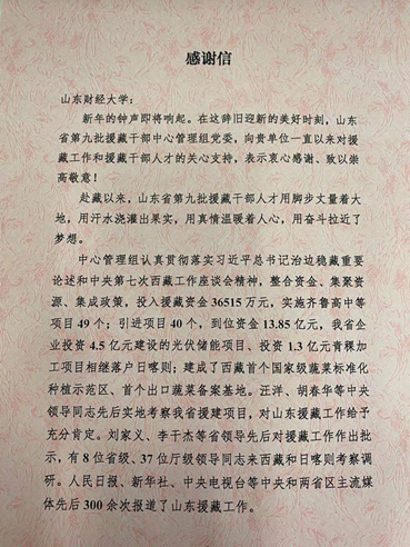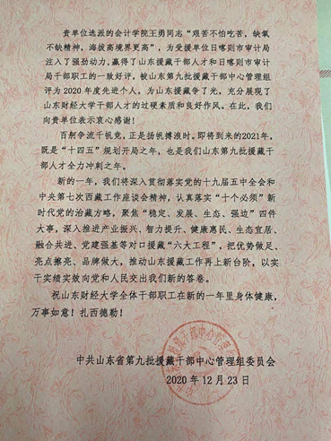 收到中共山东省第九批援藏干部中心管理组委员会感谢信