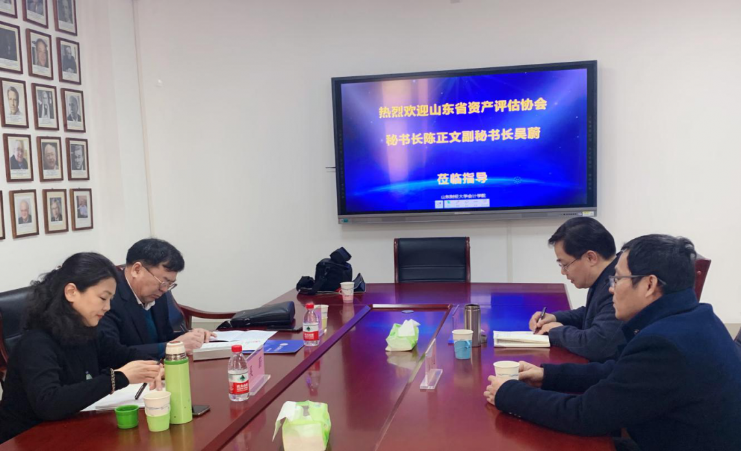 12月24日下午,成人网 与山东省资产评估协会在逸夫楼召开合作交流会议,省评协副会长兼秘书长陈正文、副秘书长吴蔚、成人网 王爱国院长、资产评估系主任刘德运副教授参与会议并进行座谈和交流,双方就资产评估行业的建设和发展展开热烈讨论。