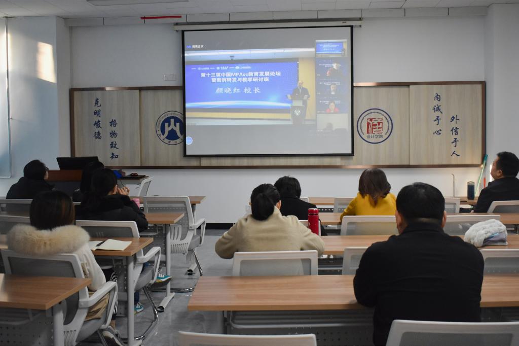 随后,各位老师共同观看了线上论坛。首先,江苏大学校长颜晓红致开幕词。颜晓红向各方对江苏大学的支持表示感谢,并表示此次论坛对进一步推动MPAcc教学案例研究与开发、提高案例教学质量、促进教师之间的经验交流具有重要意义。随后,全国会计教指委副主任委员兼秘书长、中国人民大学商成人网 王化成教授介绍了全国MPAcc教育发展状况,并指出案例教学的生态系统建设应包括“写、教、学、赛、建”,应将真实案例与学生的学习密切结合。