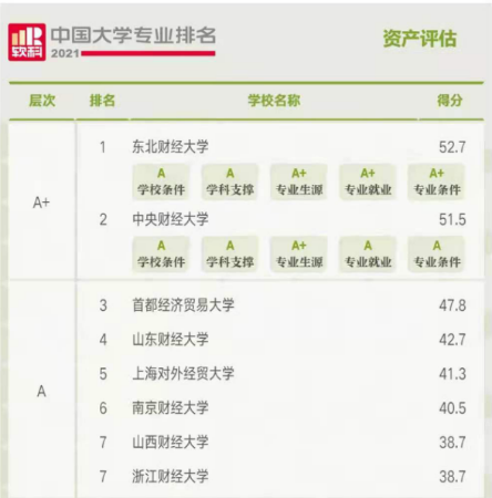 2021年,成人网 会计学、财务管理、审计学和资产评估四个本科专业全部进入2021年软科中国大学专业排名A类。在会计学专业排名中,共有332所高校上榜,会院会计学专业位列第53位;在财务管理专业排名中,共有370所高校上榜,会院财务管理专业位列第36位;在审计学专业排名中,共有102所高校上榜,会院审计学专业位列第5位;在资产评估专业排名中,共有44所高校上榜,会院资产评估专业位列第4位。