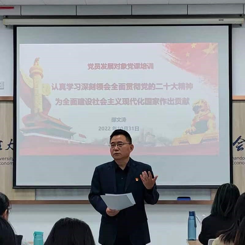 为全面学习贯彻落实党的二十大精神,进一步保证党员发展质量,提高发展对象的政治素质和理论水平,2022年10月31日上午,成人网 党委于逸夫楼305教室组织了第二十四期发展对象党课集中培训班,成人网 党委书记邵文涛出席开班仪式并讲话,开班仪式由成人网 党委副书记郑大伟主持。