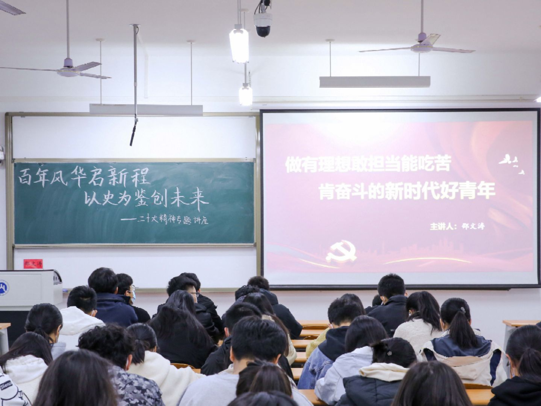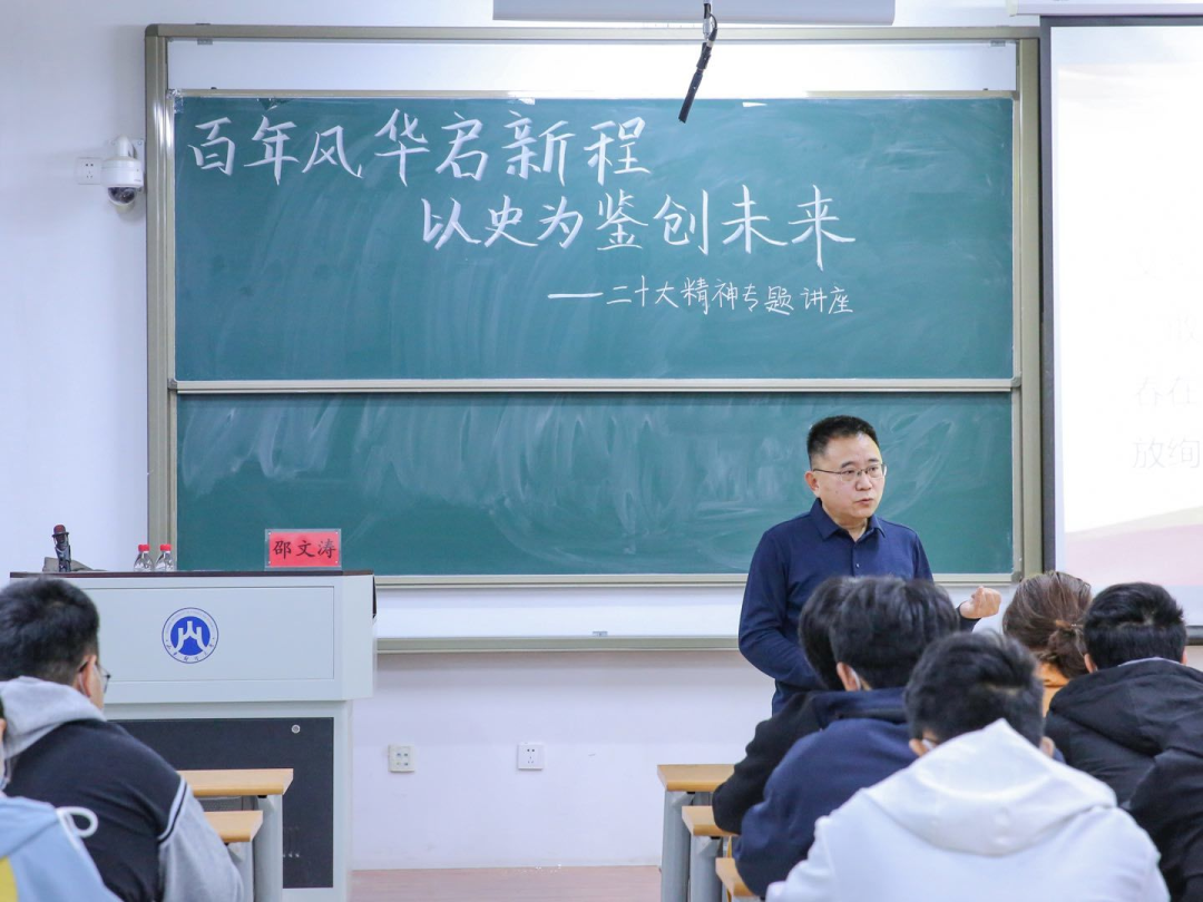 为深入学习宣传贯彻党的二十大精神,把思想统一到党的二十大精神上来,把力量凝聚到党的二十大确定的各项任务上来,引领青年学子坚定不移听党话、跟党走,引导学子们把握历史规律、认清世界形势、融入发展大势,塑造青年学生怀抱梦想又脚踏实地,敢想敢为又善作善成,努力成为堪当民族复兴重任的时代新人,11月15日19:00,成人网 党委书记邵文涛在圣井校区6218教室为学生们开展“百年风华启新程,以史为鉴创未来”二十大精神专题讲座。