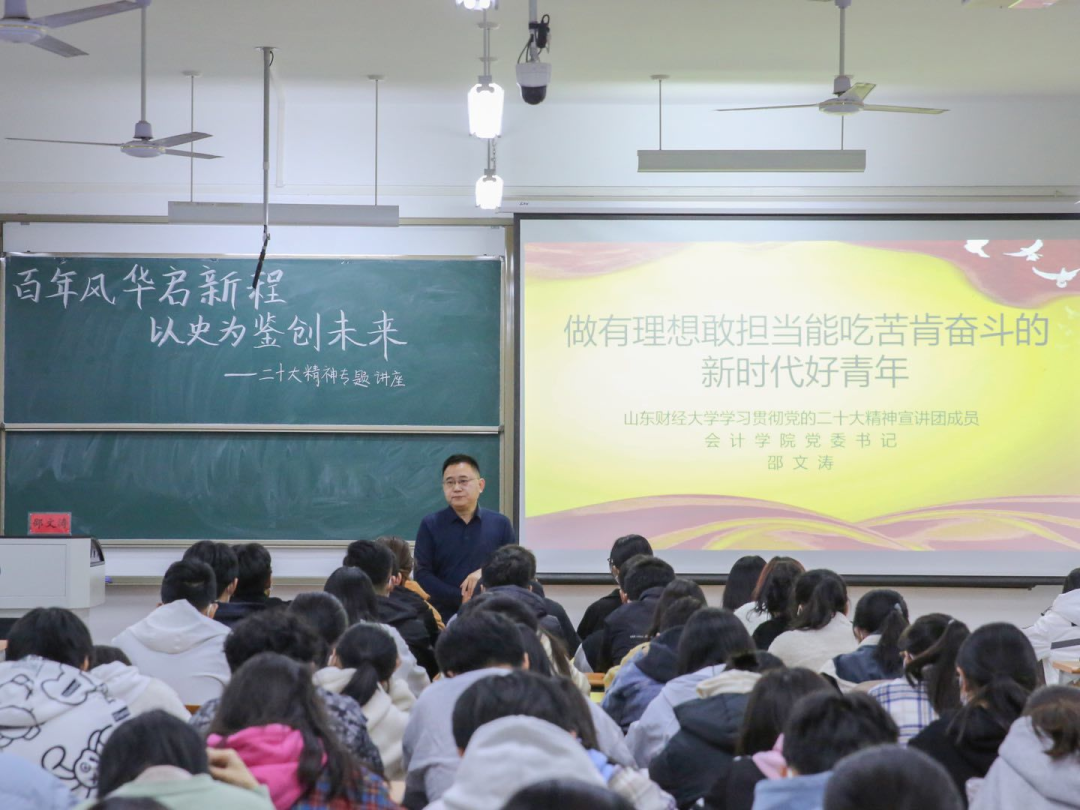 邵文涛以“做有理想敢担当能吃苦肯奋斗的新时代好青年”为主题,深入讲解了充分认识和把握学习宣传贯彻党的二十大精神的重大现实意义和深远历史意义;从党的二十大的主题、过去5年的工作和新时代10年的伟大变革、开辟马克思主义中国化时代化新境界、中国式现代化特征本质和五个“必由之路”等方面进行了系统解读。
