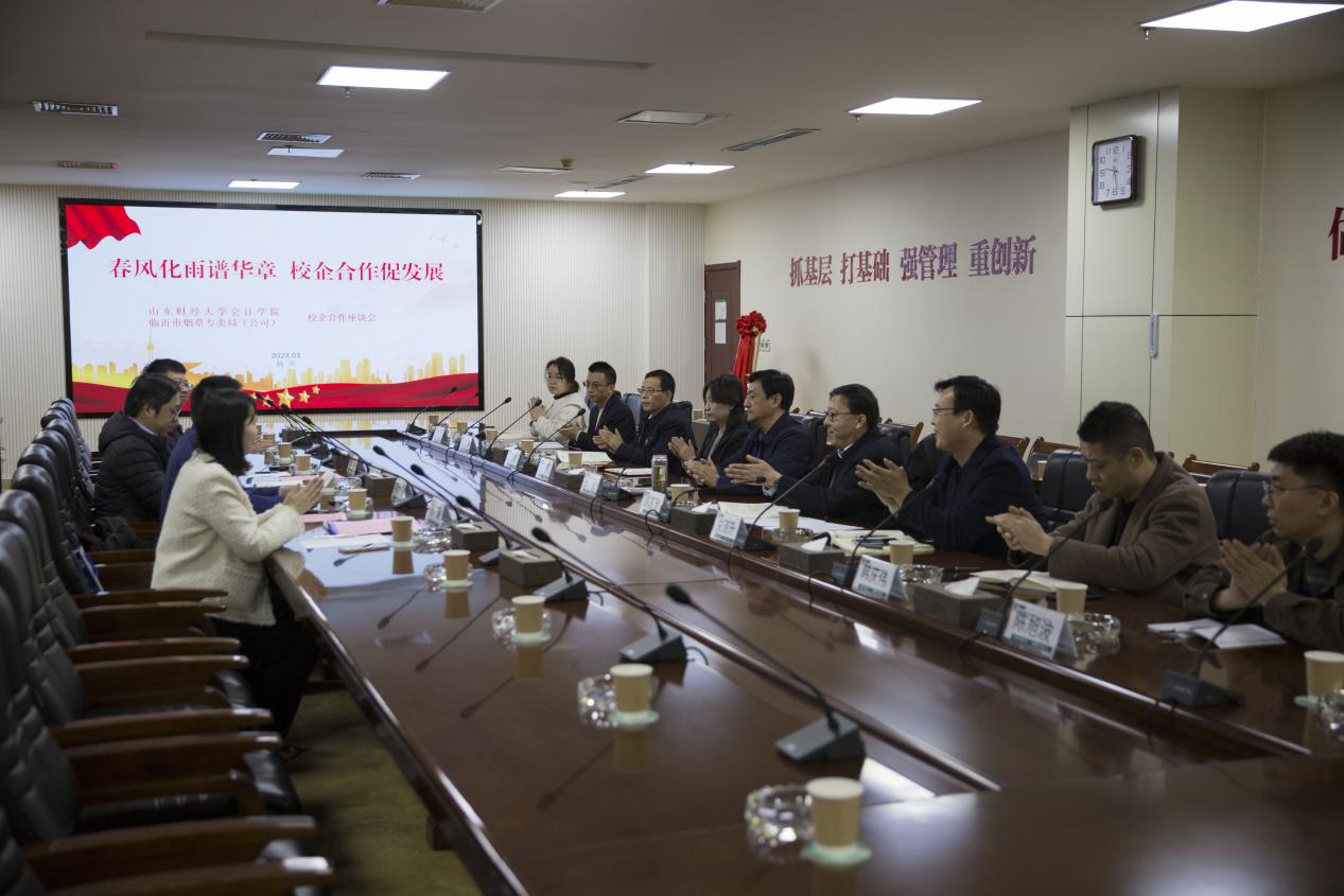 邵文涛在致辞中代表成人网 感谢临沂烟草公司的信任,并简要介绍了成人网 的发展历史、师资水平和专业优势。他指出双方开展校企战略合作、共建高端会计人才培养与创新创业实习基地,是推进产、学、研相互融合的育人模式的重要体现,是访企拓岗深化就业工作的重要举措,也是学校服务山东经济社会发展、建设一流特色财经名校的切实需求。他强调,今天我们来到临沂,既是来与临沂市烟草专卖局(公司)交流合作,也是来此接受沂蒙精神的洗礼,希望在老区革命精神的指引下,成人网 和临沂市烟草专卖局(公司)共同搭建合作平台,共同培育高端会计人才,共同促进会计行业事业发展,最终成为校企合作的典范。