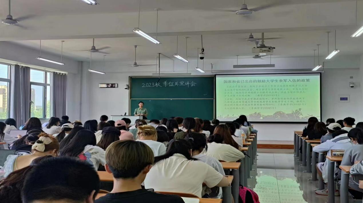 为更好的传达大学生入伍政策,鼓励引导同学们应征入伍,6月1日和6月5日,成人网 先后举办两场2023年度秋季征兵政策宣讲会,由校国防教育宣讲团成员为成人网 学生进行入伍宣讲。