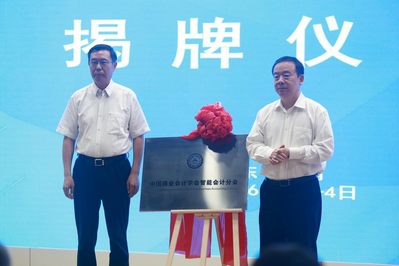 黄国成宣读了中国商业会计学会批准成立智能会计分会的决定。王邵军和张新民共同为中国商业会计学会智能会计分会揭牌。