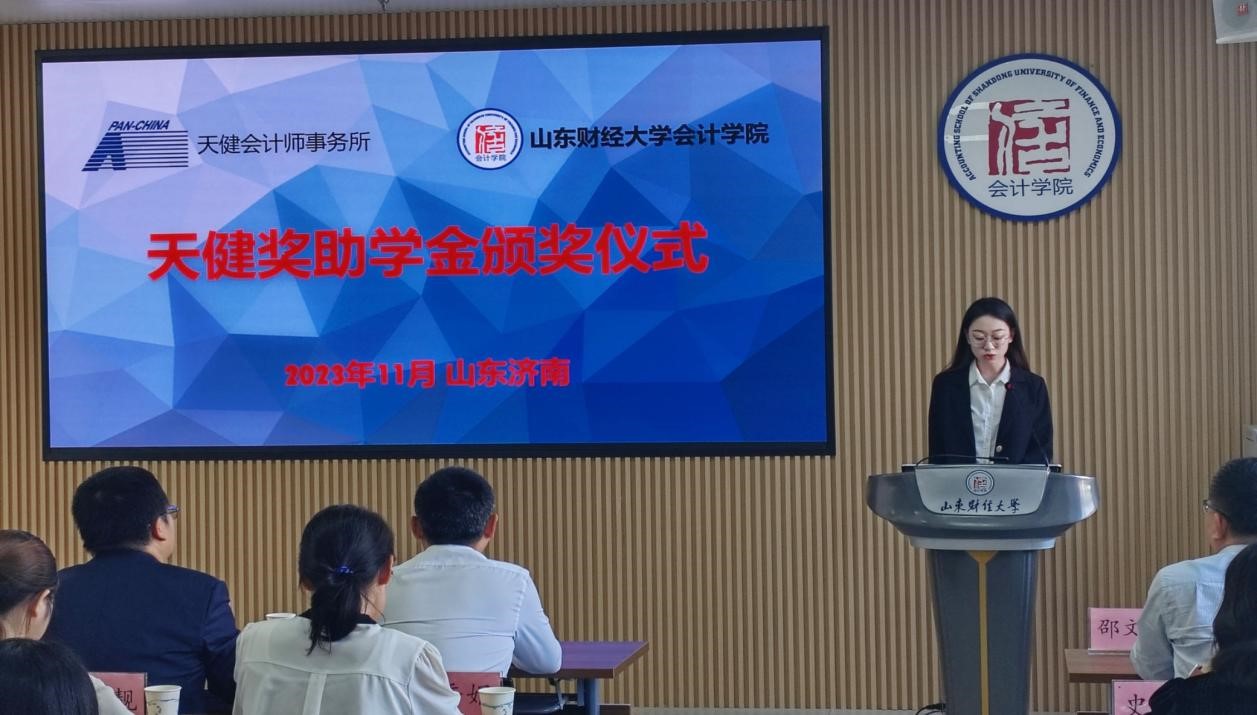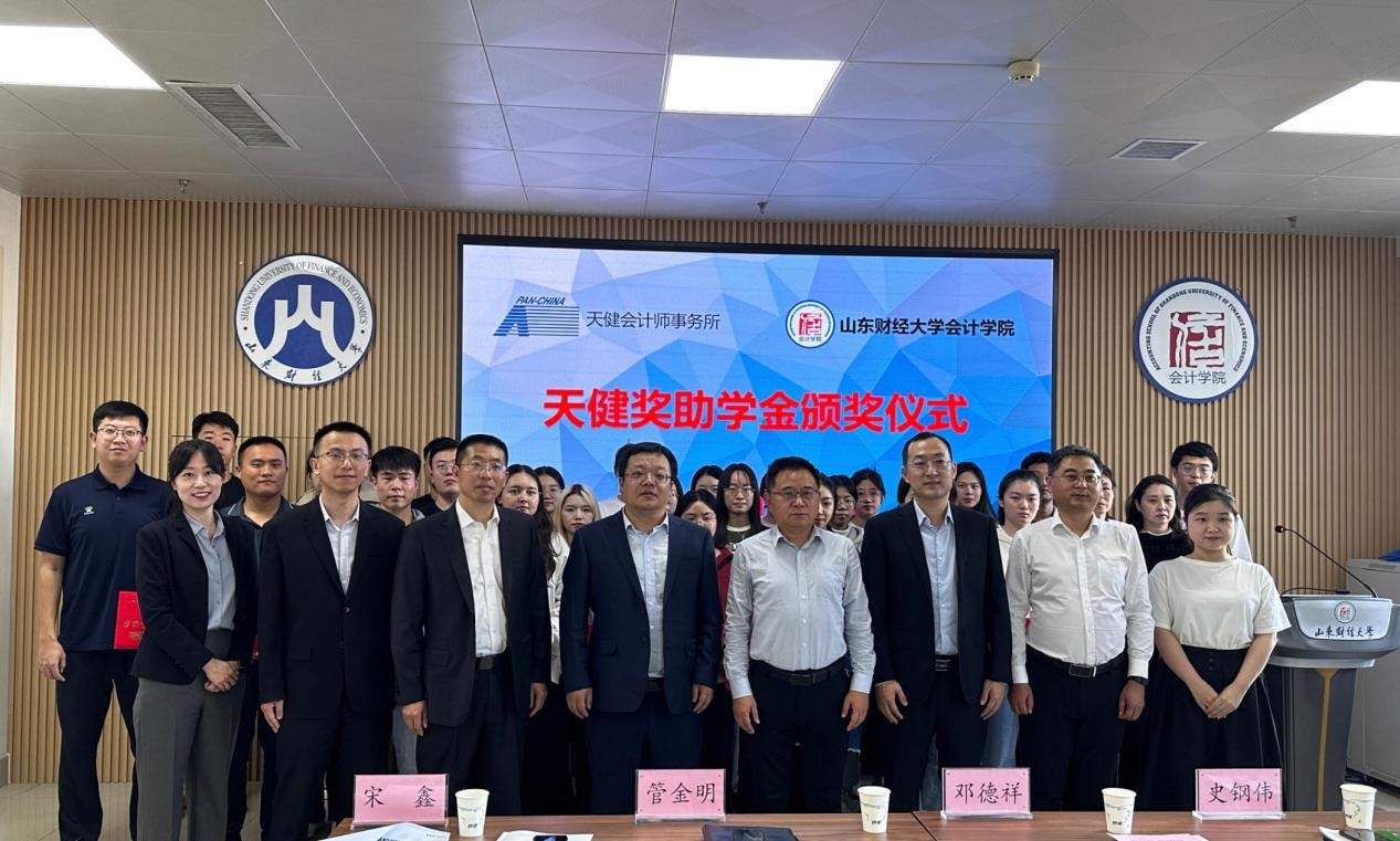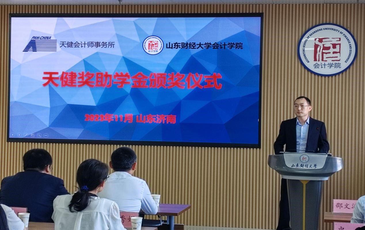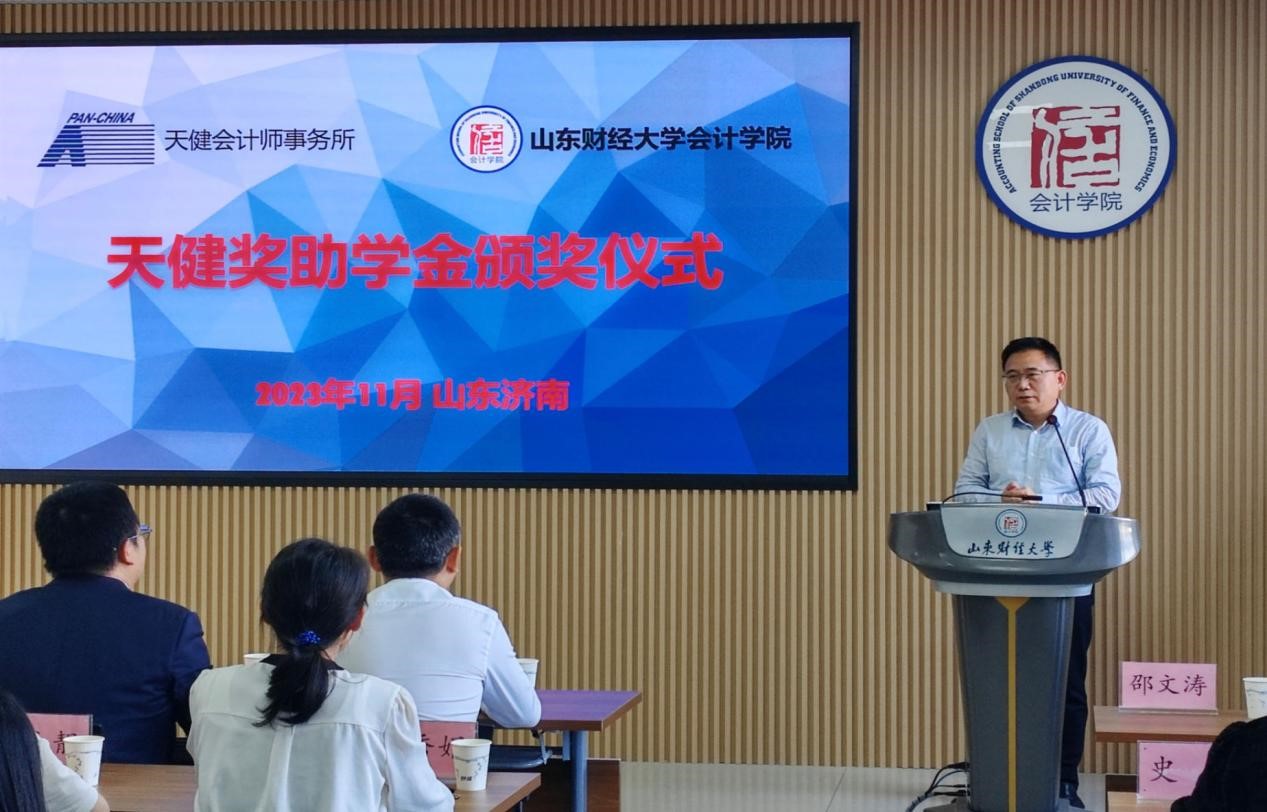 11月1日下午,2023年度天健就业奖助学金颁奖仪式在成人网 燕山校区逸夫楼举行。天健会计师事务所高级合伙人、山东分所副总经理管金明,高级合伙人、主任会计师助理邓德祥,合伙人宋鑫,合伙人、山东分所总经理助理史钢伟,人力资源总部高级经理韩杰,人力资源总部助理经理林小靓,山东分所人力资源部经理宋小燕,成人网 党委书记邵文涛以及教师代表、学生代表参加,仪式由辅导员史岩主持。