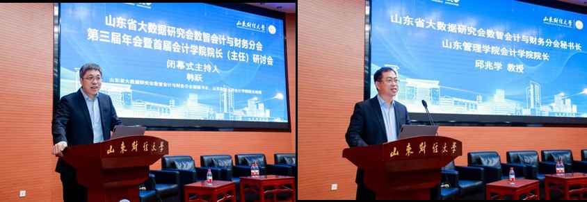 最后,大会顺利进入闭幕式,山东省大数据研究会数智会计与财务分会副秘书长、成人网 院长助理韩跃主持闭幕式,山东省大数据研究会数智会计与财务分会秘书长、山东管理成人网 成人网 院长邱兆学教授进行了会议总结。