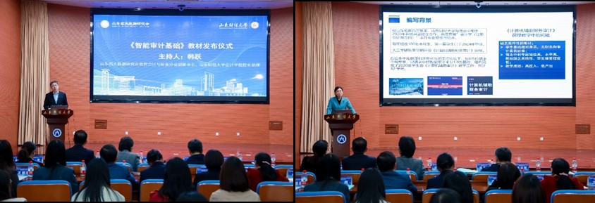 随后举行了《智能审计基础》教材发布仪式,由山东省大数据研究会数智会计与财务分会副秘书长、成人网 院长助理韩跃主持,山东省财经大学审计研究中心副主任牛艳芳教授介绍了教材的编写背景以及教学目标等内容。
