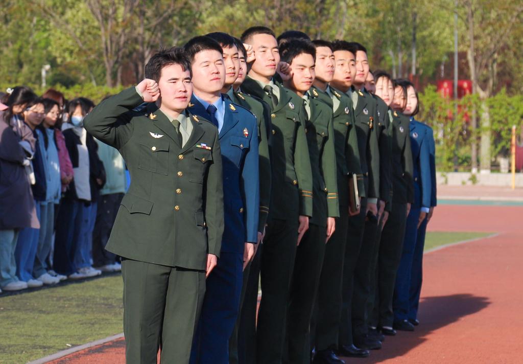 随后,退役大学生士兵在2023级和2024级全体学生见证下,重温退役誓词。他们面对国旗,喊出“若有战,召必回”的誓言,表达了维护国家安全的坚定决心。