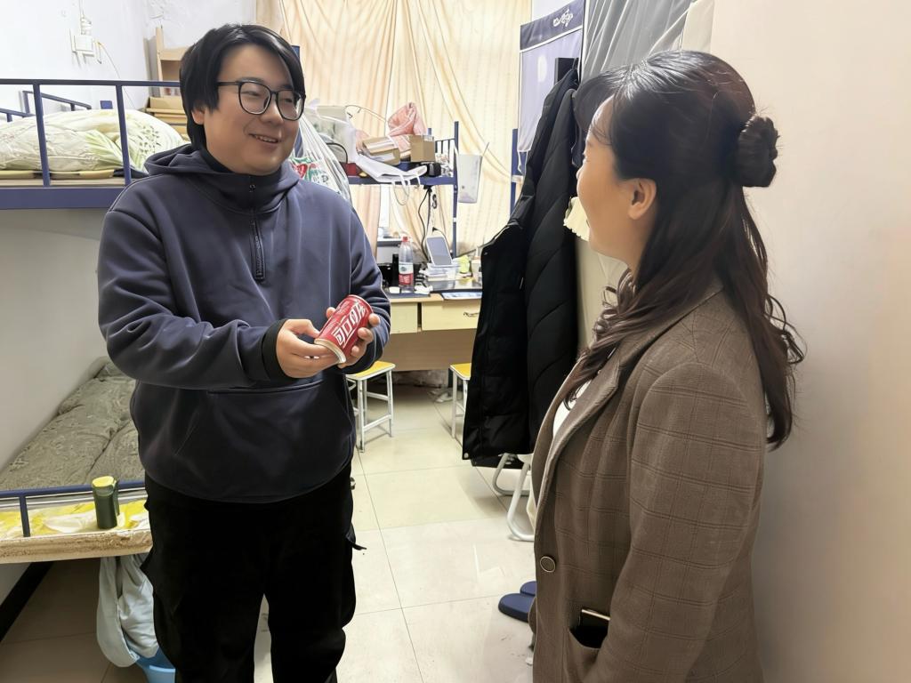 12月18日,寒意袭人,学生宿舍楼内却暖意涌动。成人网 党委书记任海伦带队,毕业班辅导员手提满满当当的定制可乐,走进一间间考研学子的宿舍。“最近复习节奏跟得上吗?遇到瓶颈别慌,及时调整心态最重要。”“全力以赴,成功上岸!加油!”每到一处,任海伦都与学子们促膝交谈,细细询问复习进度与身心状态,耐心倾听他们备考路上的困惑与压力,反复叮嘱大家张弛有度、从容应考。老师们贴心分享调节情绪的小技巧,鼓励学子们遇到困难随时与老师、同学沟通,“成人网 永远是你们最坚实的后盾。”一瓶瓶红彤彤的定制可乐递到学子手中,让冬日的宿舍里暖意融融。
