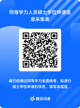通过2025年同等学力全国统考、拟进行硕士学位申请的学员,请于2025年9月30日前扫下面二维码,根据二维码中的要求填报姓名、联系方式、申请硕士学位外国语水平和学科综合水平全国统一考试成绩等相关信息进行硕士学位申请报名。