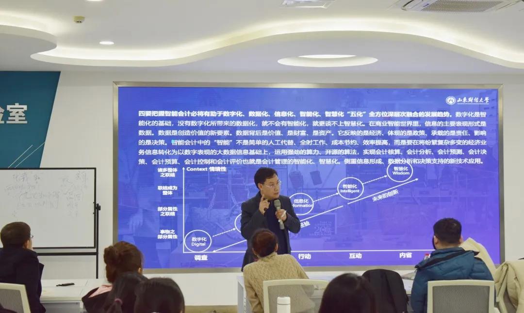 王院长从八方面对成人网 面对人工智能等新技术的冲击和挑战的基本共识和经验做法进行阐述。一是“会计是重要的,它不会消失”,会计有着悠久的发展历史,对解决信息不对称问题、维护产权制度和明确利益关系有着重要作用,可以说,经济要发展,就离不开会计。二是“会计是技术的,它需要变革”,会计的技术性决定了其在工商管理学科中具有很强的技术壁垒,新技术推动下的商业模式、生产方式和管理范式的智能化变革将以“业财融合”为基础,向“数据智能”方向转型,使核算会计向管理会计转变,实现会计与财务、对外会计与对内会计的大统一,经济业务与财务活动大融合。三是智能会计概念的提出,王院长将这种以“数字经济”为前提、“业务融合”为基础、“财务共享”为平台、“人工智能”为支撑,形成的满足经济管理数据分析和辅助决策信息需要的人机共生、协同进化、管理赋能的会计管理活动命名为智能会计,并进一步指出在智能会计背景下,会计教育从通识教育理念指导下的专门教育、职业教育、专才教育向大会计教育或大财务教育转变。四是智能会计人才培养方案,智能会计专业人才需要具备企业战略思维,熟知会计逻辑、数学逻辑,具备数据分析能力和计算机编程能力。五是成人网 对智能会计建设的实践和推介,包括成人网 与浪潮集团合作共建的智能会计实验室、组建“智能会计”实验班、编写高等学校智能会计系列教材、培养“山财模式”智能会计人才。六是对智能会计发展的进一步思考,王院长指出智能会计发展要坚持维护产权制度、明确利益关系的经济制度本质,把握智能会计有助于物质流、财务流、信息流深度融合的发展趋势;把握智能会计有助于财务会计、成本会计、管理会计、财务会计等会计整合为“大会计”的发展趋势;把握智能会计助于数字化、数据化、信息化、智慧化,“五化”全方位深层次融合的发展趋势。七是对相关教材的介绍。八是对智能会计发展期望。讲座最后,王院长指出成人网 举办了“首届智能会计发展国际高峰论坛(线上)”来推动智能会计发展,同时希望同学们在后续的研究中关注智能会计的发展。
