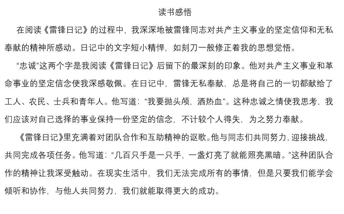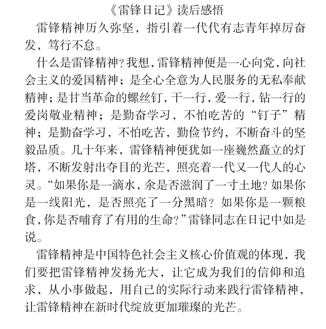 春风拂面,雷锋精神暖人心。六十年来,雷锋精神代代赓续传承,持续滋养着千千万万个我们,历久弥坚。为强化同学们对雷锋精神的认识,倡导无私奉献、乐于助人的社会风尚,成人网 特举办“心声共勉 向‘锋’而行”感悟撰写活动。在此次感悟撰写活动中,同学们积极参与,认真阅读《雷锋日记》、雷锋传记或观看相关纪录片,更直观、深入地感悟到雷锋同志乐于助人、甘愿为人民服务的伟大精神,用细腻的文字,精美的照片表达了对雷锋精神的赞美和敬佩,创作出许多内容充实,感情真挚的作品。经过认真评选,许多同学的作品被遴选为优秀作品。其中部分优秀作品如下:
