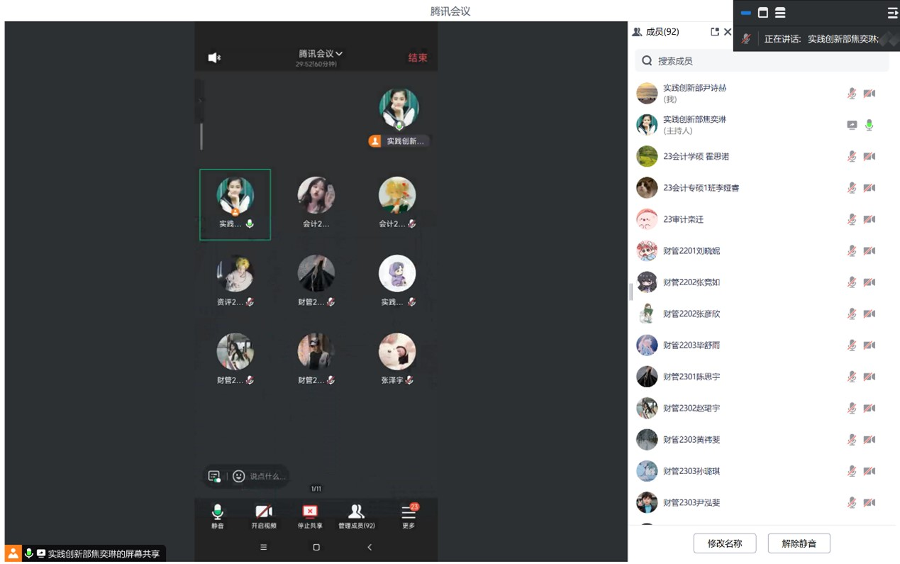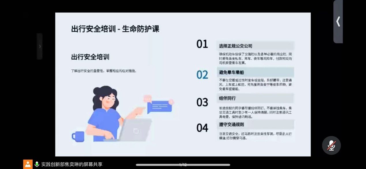 本次会议以线上形式开展,与会成员为实践团队队员,共计92人。本会议主要围绕财产安全、出行安全、卫生安全、人身安全、天气安全五个部分进行讲解。