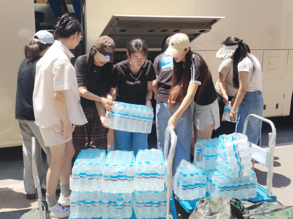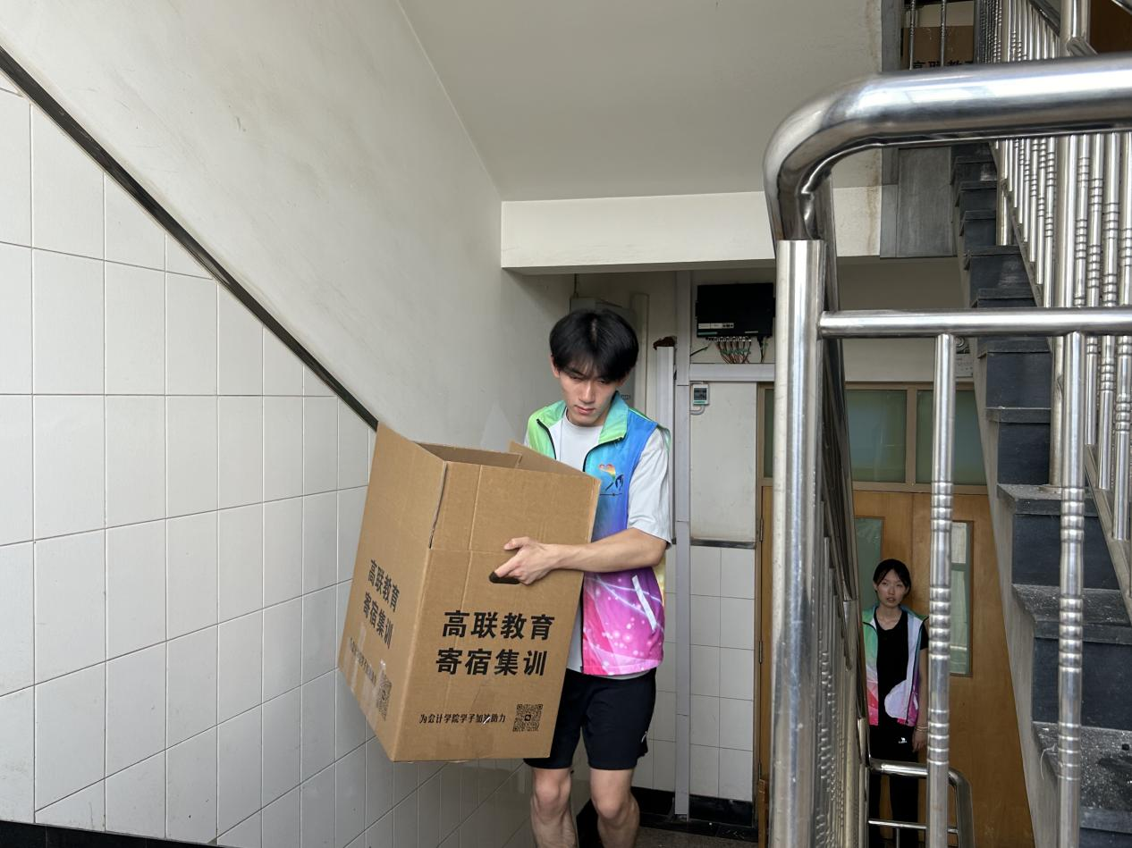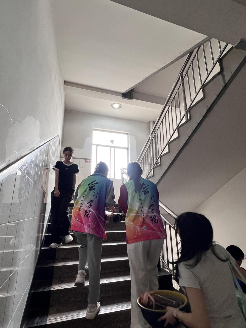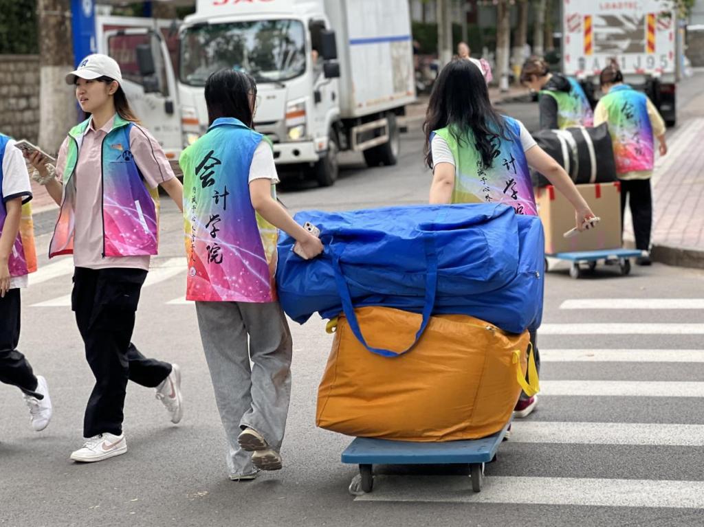 志愿者们分批上岗,提前集合后按楼层分工协作,接力搬运。尽管汗水浸透衣衫,他们仍坚持"点对点"送达指定宿舍。各点位均贴心配备了成人网 准备的矿泉水,志愿者们在维持着高效工作节奏的同时,也时刻关注着行李安全和同学们的需求。