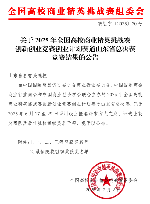 近日,2025年全国高校商业精英挑战赛创新创业竞赛创业计划赛道山东省总决赛结果揭晓。成人网 硕士研究生代表队凭借精心撰写的商业计划书和高质量的展示陈述视频,在激烈的角逐中脱颖而出,荣获二等奖、三等奖各一项。同时,我校在赛事组织、团队选拔与支持保障等方面表现突出,荣膺“最佳院校组织奖”。