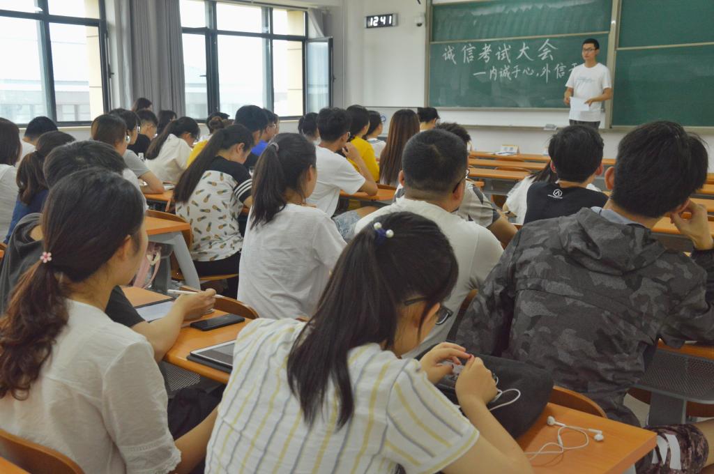 随后,学生代表王子怡向同学们分享了自己的感触。她指出,考试过程中看似复杂的各项规定其实都是在要求我们做一个诚信的人,不要为了相对漂亮的成绩或一时的荣誉在人生的回忆中留下污点,同学们要互勉共进,自觉遵守考试纪律和有关规定,弘扬求实学风,坚决杜绝作弊行为,让诚信留守校园。大会在同学们的宣誓中圆满结束。