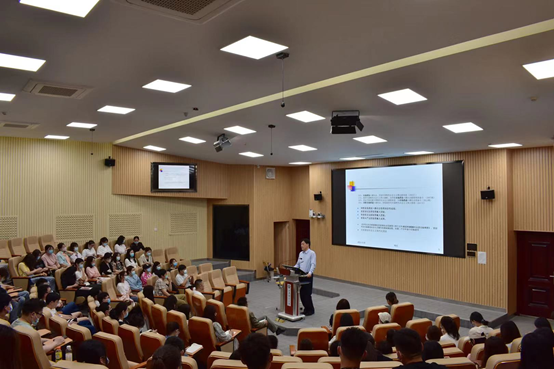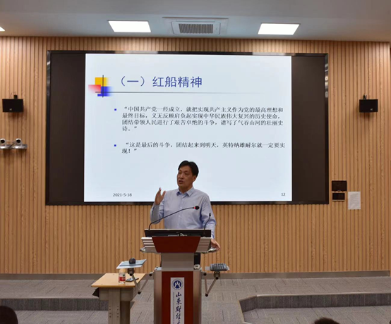 首先,沈教授对中国共产党精神谱系进行了专题辅导。他选取红船精神、“两弹一星”精神和脱贫攻坚精神作为革命时期、建设时期、改革时期三个不同时期中国共产党精神的典型代表,以王尽美、郭永怀、刘嘉坤为例进行详细阐述。他强调,这三种“不怕死、敢拼命、能奉献”的精神为同学们辩证看待现实与理想、物质与精神、个人与他人之间的关系带来深刻启发。其次,沈教授指出,中国共产党员的精神来源于马克思列宁主义,在三大时期,通过马克思列宁主义基本原理与中国具体实践相结合产生了毛泽东思想、邓小平理论(包括“三个代表”重要思想、科学发展观)、以及习近平新时代中国特色社会主义思想三次理论飞跃。最后,沈教授又提到了共产党员的追求,即站在决胜全面建成小康社会已取得决定性成就这一时点,未来十四五规划和2035年远景目标就是全面建设社会主义现代化国家。同时,我们要充分认识到现代化进程是一个长期的过程,我们在追求远大目标时,一定要正确处理好现实与理想、物质与精神、个人与他人之间的关系,为实现崇高理想努力奋斗。