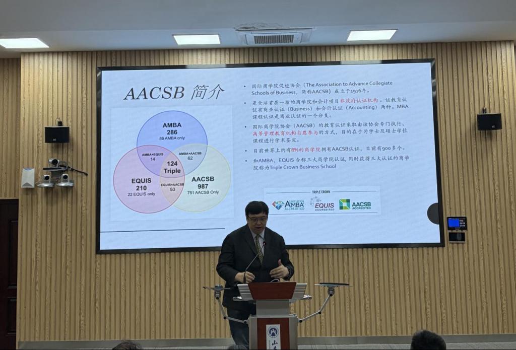 本次培训会聚焦AACSB认证经验分享,特邀澳大利亚沃隆贡大学商成人网 会计系主任黄泰然博士(Dr. Tairan Kevin Huang)担任主讲人。黄泰然博士长期深耕AACSB认证领域,不仅熟悉国际商科教育认证的标准体系与核心要求,更拥有丰富的认证实践指导经验。黄泰然博士结合澳大利亚沃隆贡大学商成人网 的认证历程,从AACSB认证的核心价值、评估维度、关键流程等方面进行了系统讲解。他重点围绕“学习保障(AoL)体系构建”“课程与认证标准的衔接”“师资能力提升与学生学习成果评估”等关键问题,结合实际案例拆解认证过程中的重点与难点,为参会教师提供了极具针对性的解决方案。同时,黄博士还针对成人网 当前认证推进阶段的实际需求,提出了“强化数据支撑、优化课程矩阵、注重成果闭环”的建议,为成人网 后续认证工作的精准推进提供了国际视野下的参考路径。